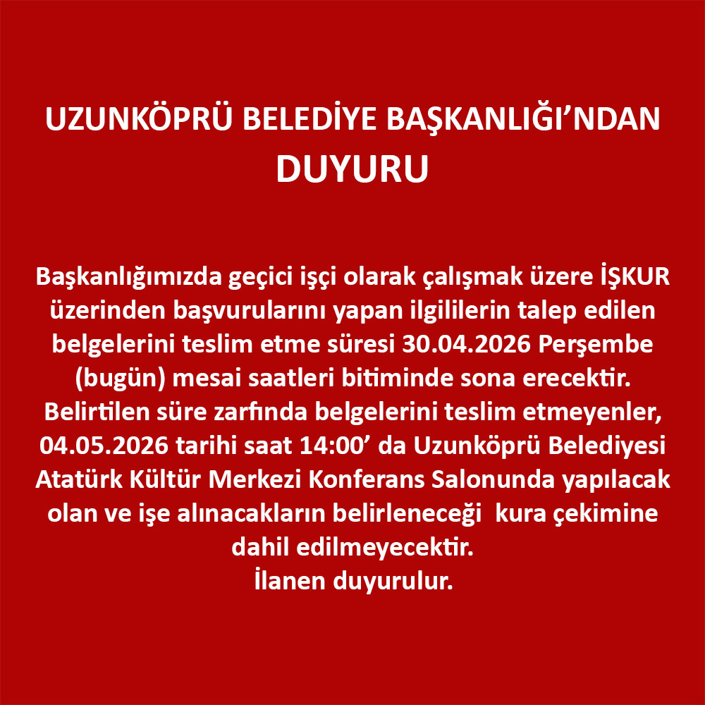 İşçi Alım İlanı ; Uzunköprü Belediyesi Personel Ltd. Şti. ‘nde çalıştırılmak üzere personel alınacaktır. Alınacak personele ilişkin detaylara ve “Kurum Dışı Kamu